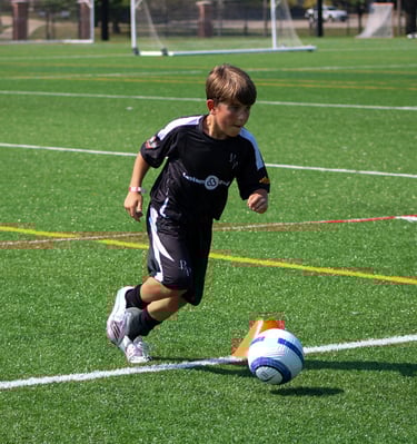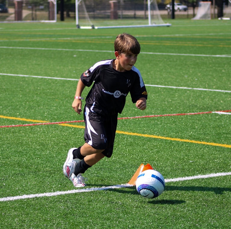 A focused young athlete practicing dribbling drills on a sunny soccer field.